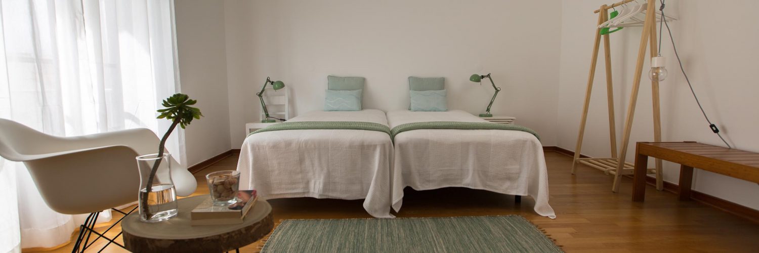 This is one of the biggest rooms in the house, two single big beds (90×200 cm) prepared for a couple or for two persons. A wide working desk. To relax, a reading area with a comfortable DAR chair and side small table. Super spacious room. Natural light and a door to a balcony overlooking the Serra do Montejunto. The room also provide luggage support and a range of clothing hangers.