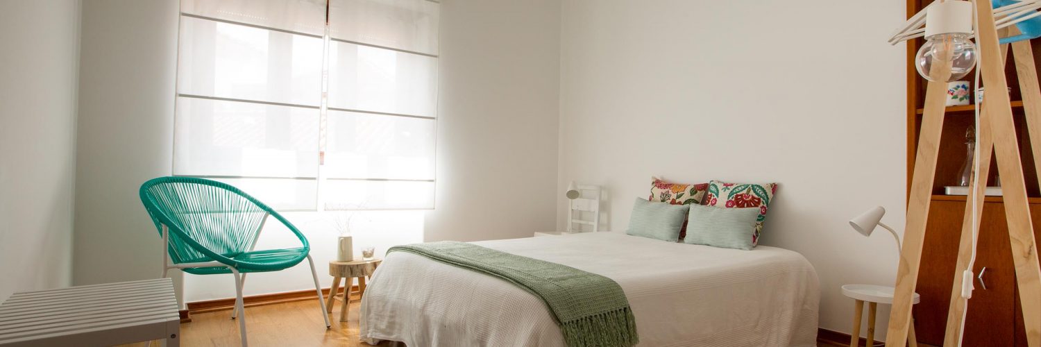 Uma cama individual (90×200 cm). O branco continua a ser o rei, mas do verde-claro passámos para um acolhedor e moderno preto e branco. Um roupeiro com vários cabides e bastante espaço para relaxar. Este quarto liga diretamente ao pequeno quintal dos fundos.