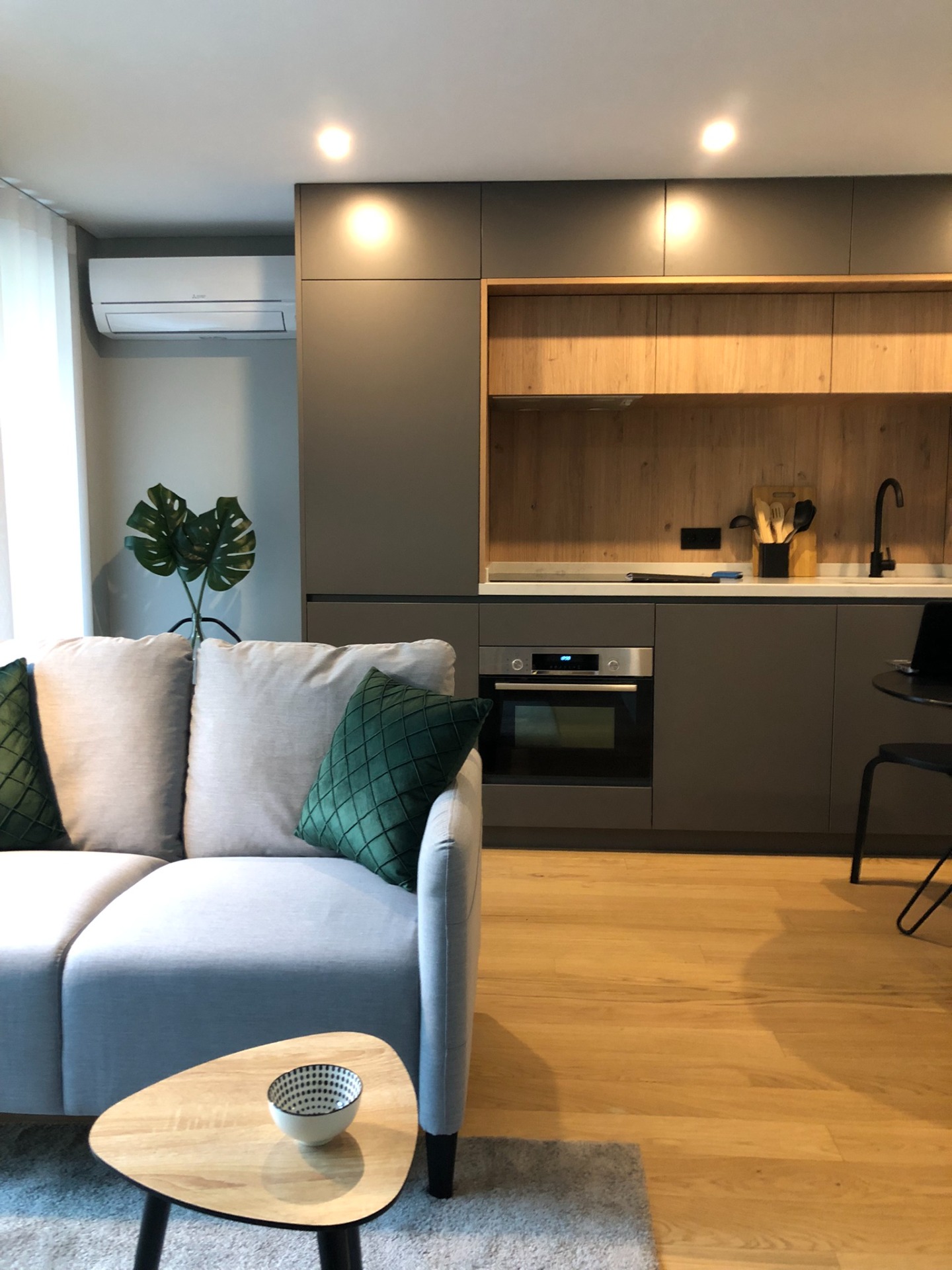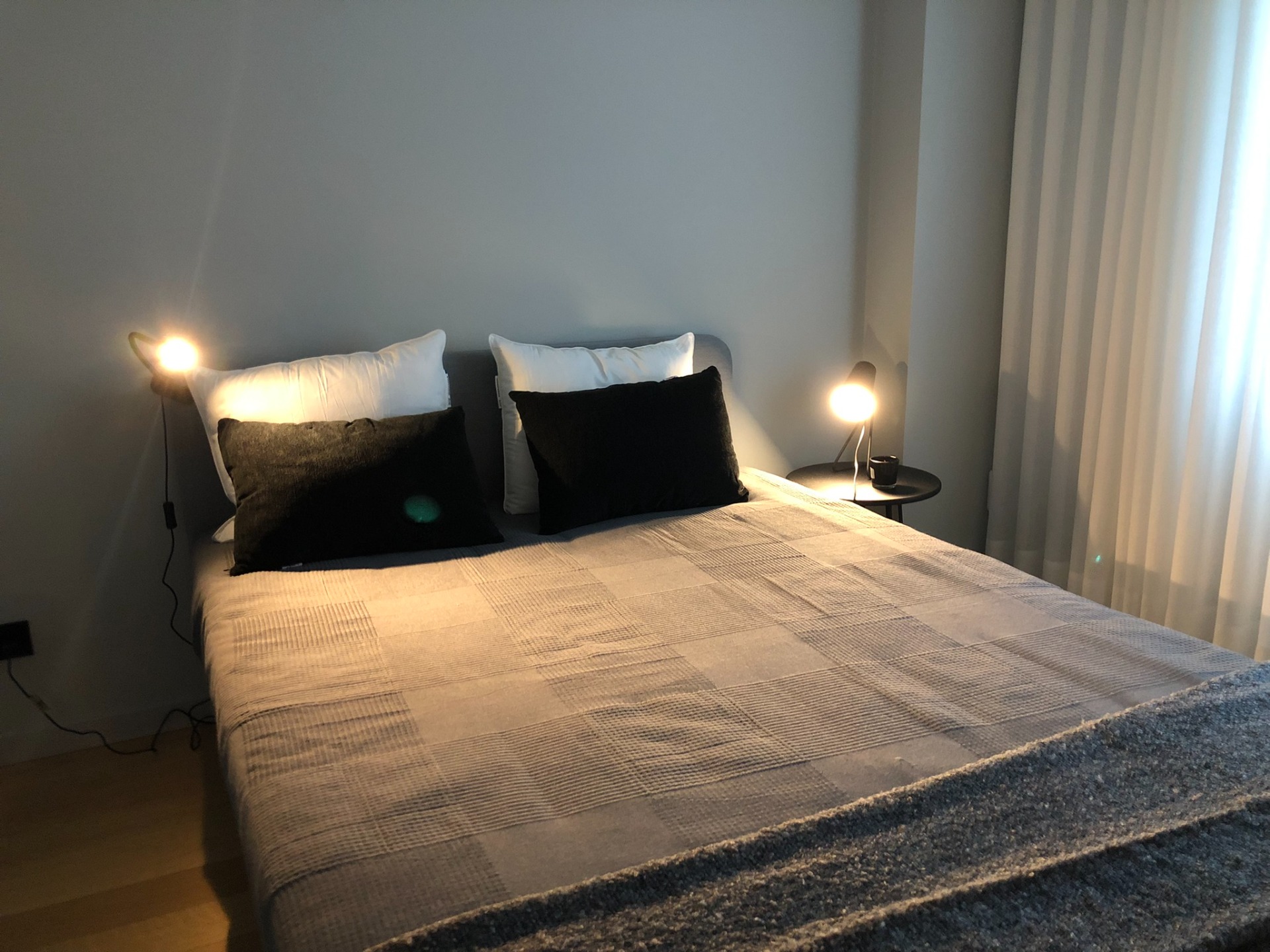 O branco continua a ser o rei, mas do verde-claro passámos para um acolhedor preto e cinzento. No rés-do-chão encontra-se a The Minimal House II. Dispõe de 2 quartos duplos equipados, 1 quarto individual, 1 casa de banho, cozinha equipada e uma ampla sala de estar com mesa para todos. Esta casa tem capacidade para 5 pessoas + 1 pessoa adicional (sofá ou cama extra).